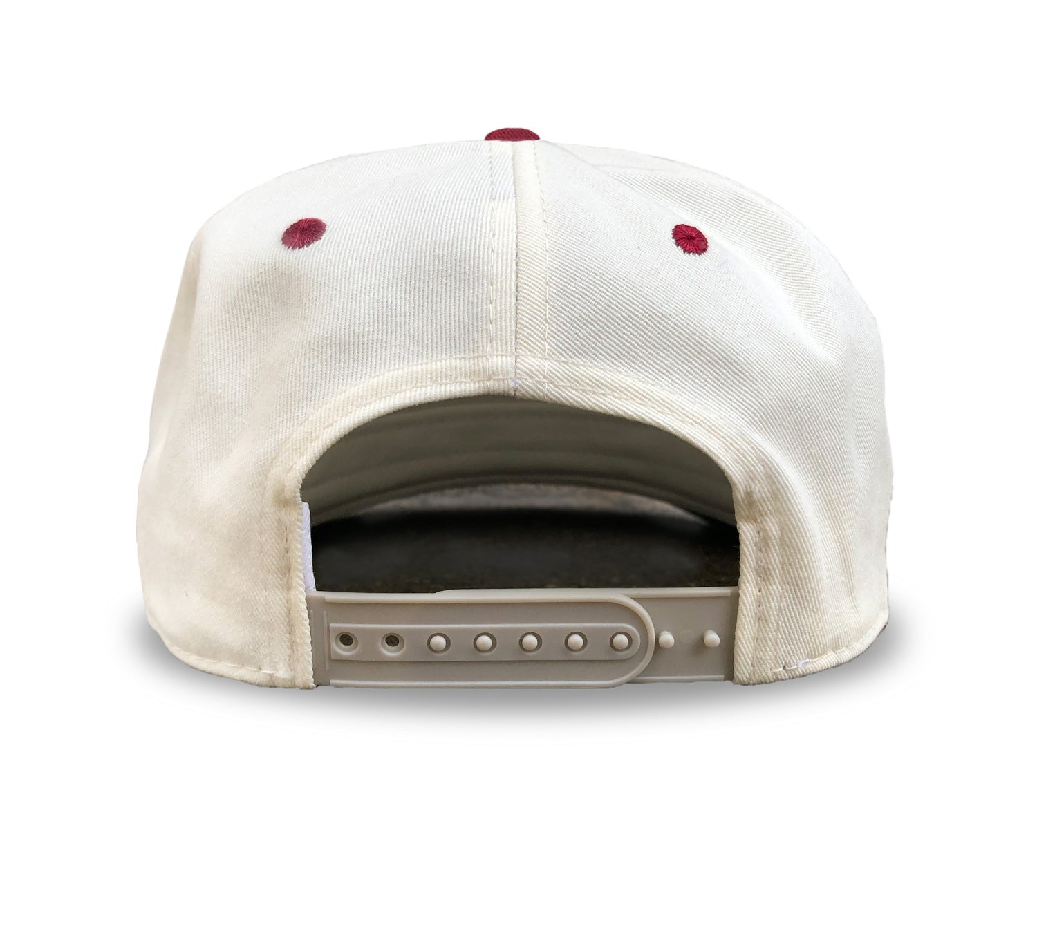 - Color: Cream hat, maroon brim