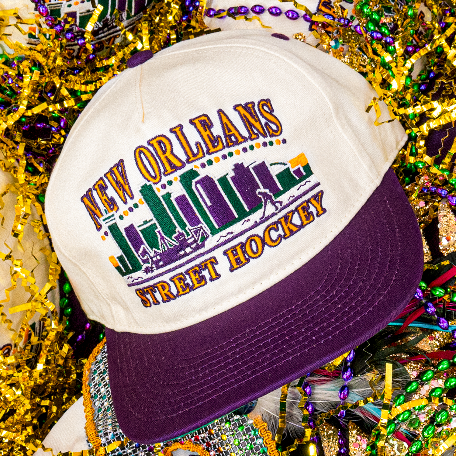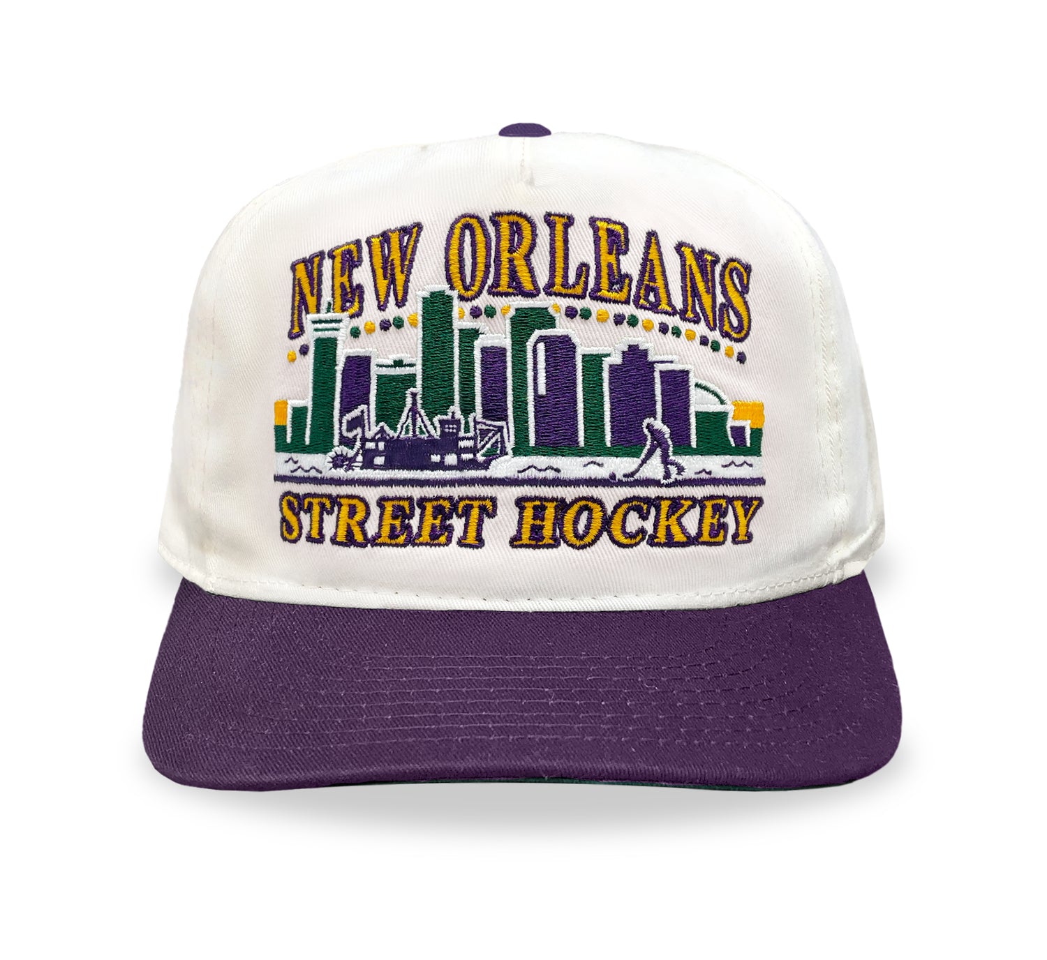 A nod to hockey fans in the Big Easy. Showcasing the New Orleans skyline in the traditional Mardi Gras colors, alongside a classic riverboat on the Mississippi.